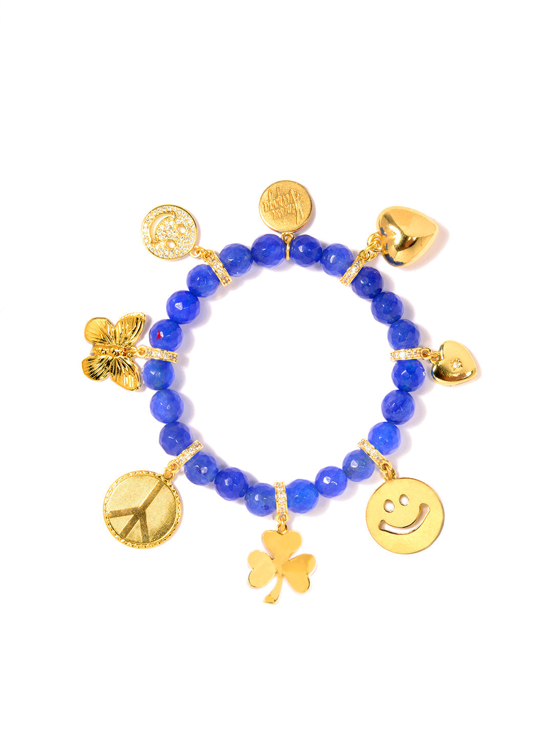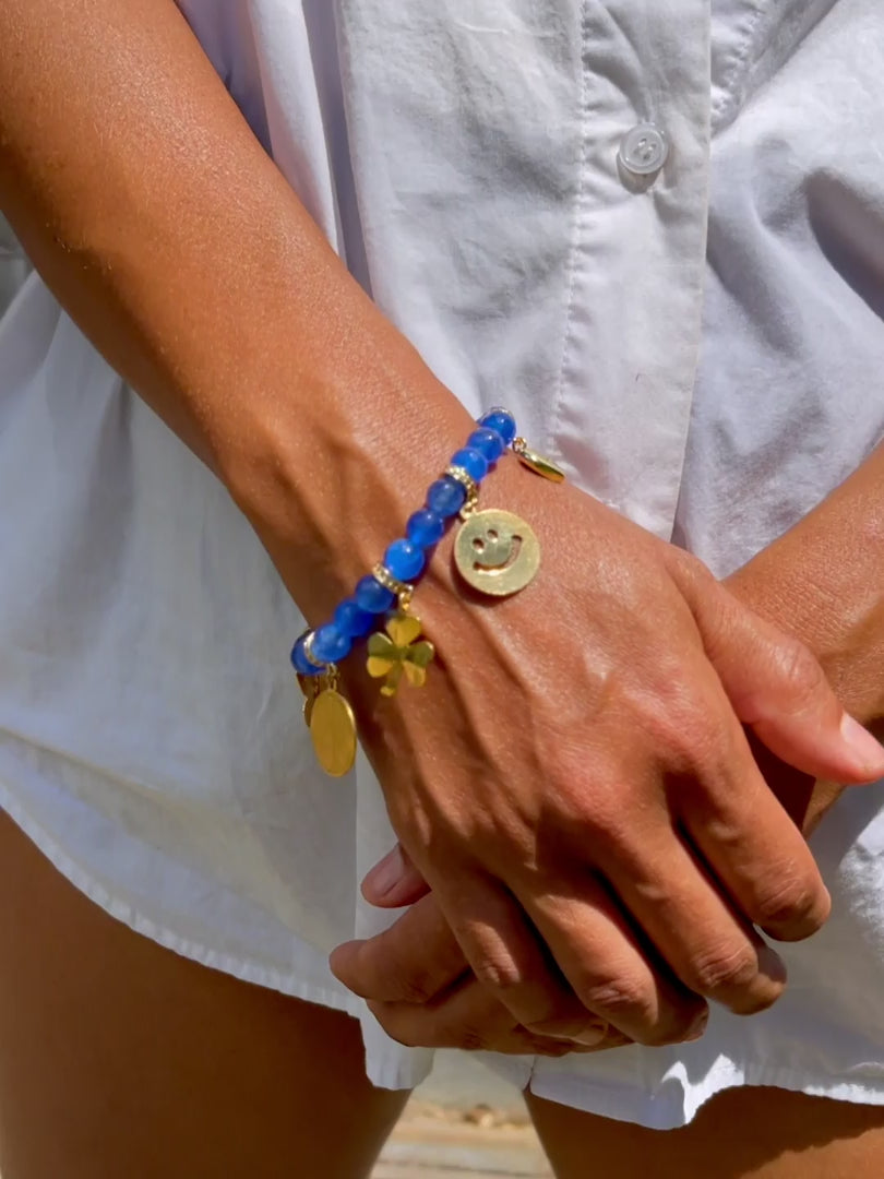 Spread the positive energy with our Good Feeling Bracelet. Made with dyed jade and pave rhinestone charms, it features a clover for good luck, a peace sign for inner peace, a smile for positive vibes, and a butterfly for transformation.