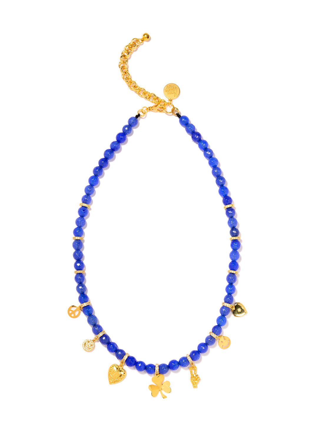 Spread the positive energy with our Good Feeling Necklace. Made with dyed jade and pave rhinestone charms, it features a clover for good luck, a peace sign for inner peace, a smile for positive vibes, and a heart for love.