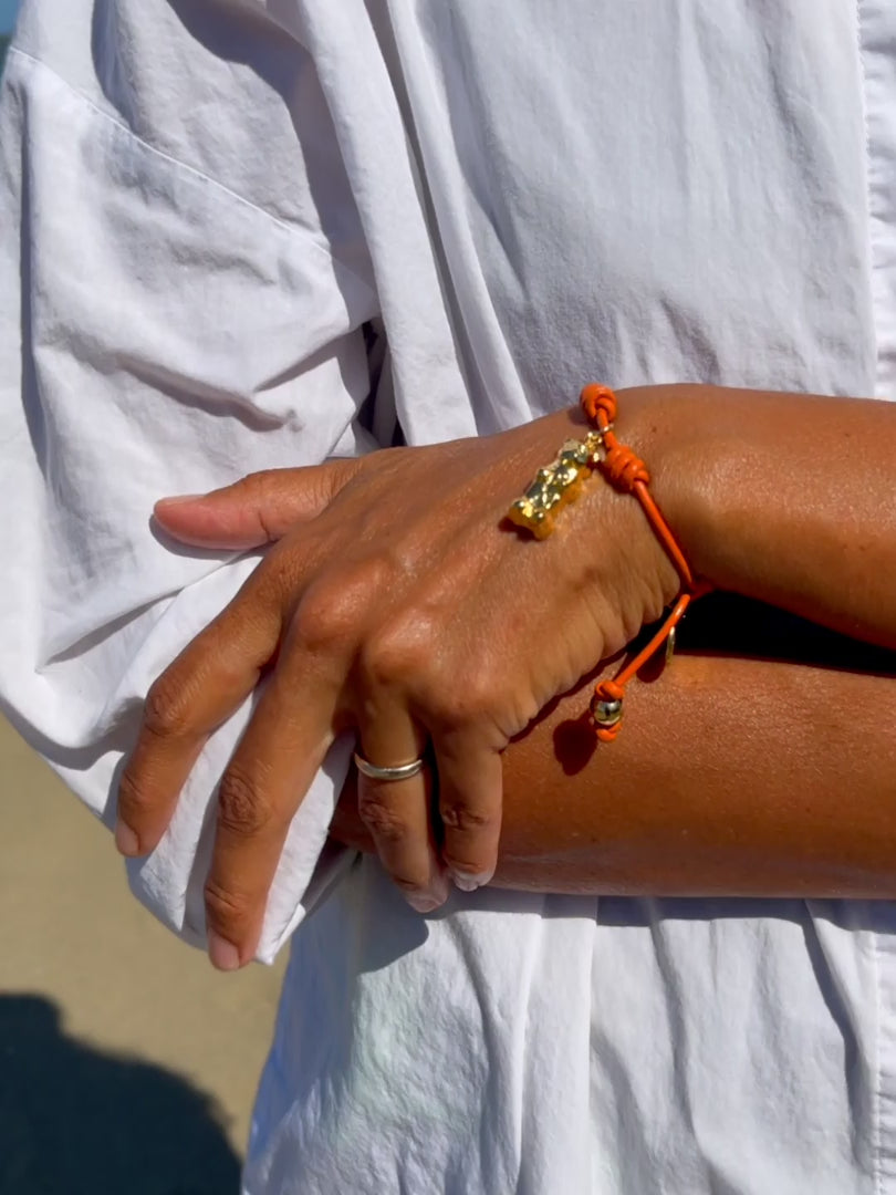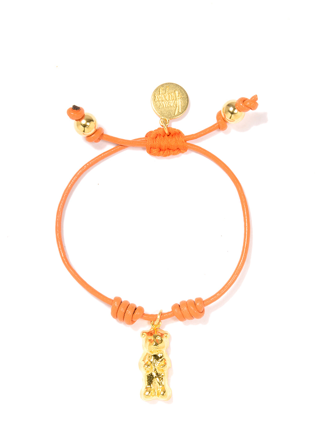 Our Gummy Bear Leather Bracelet features an orange leather cord and adjustable drawstring closure adorned with a metal gummy bear charm. Perfect for layering, this bracelet will add a touch of sweetness to any outfit.