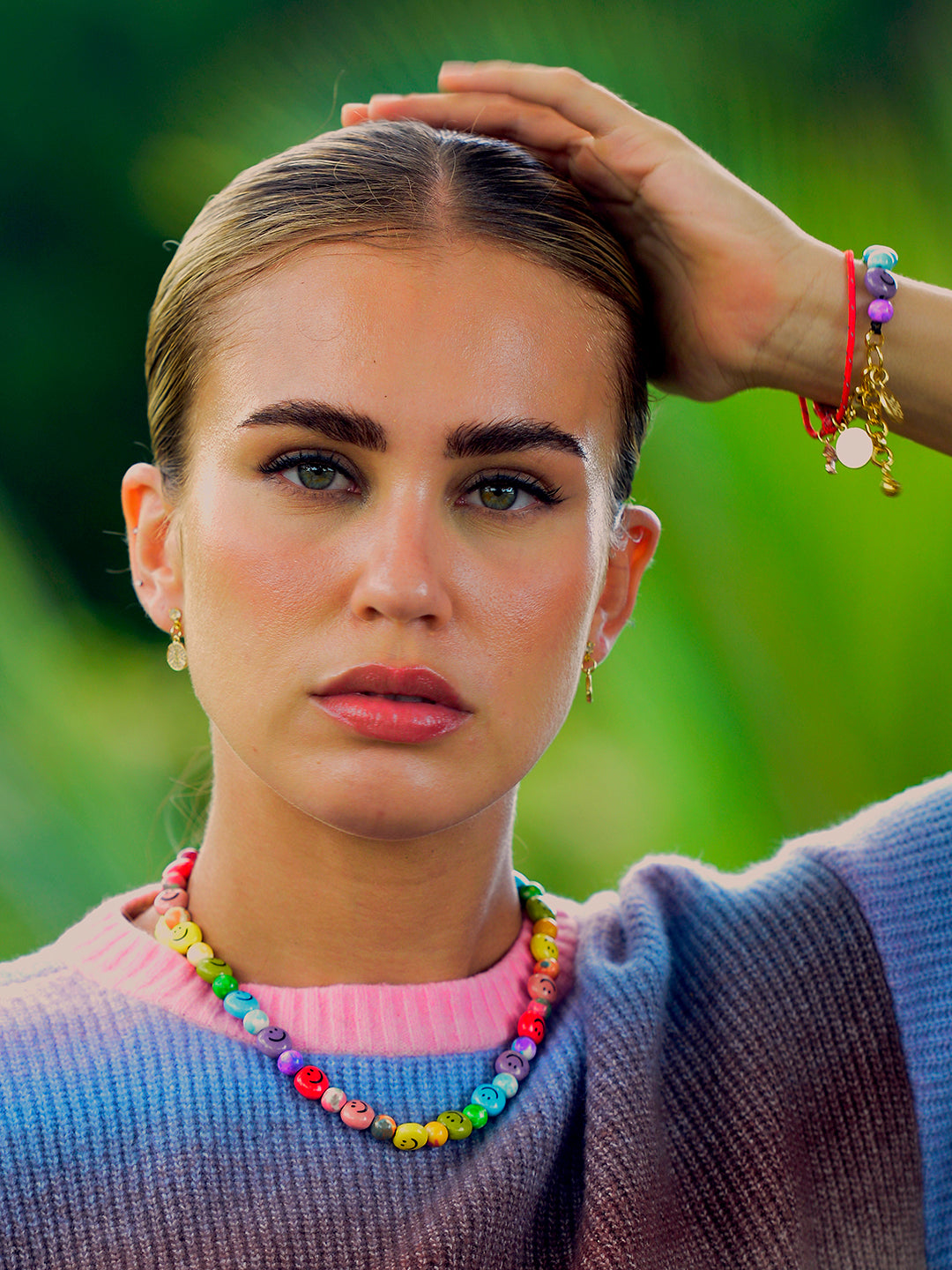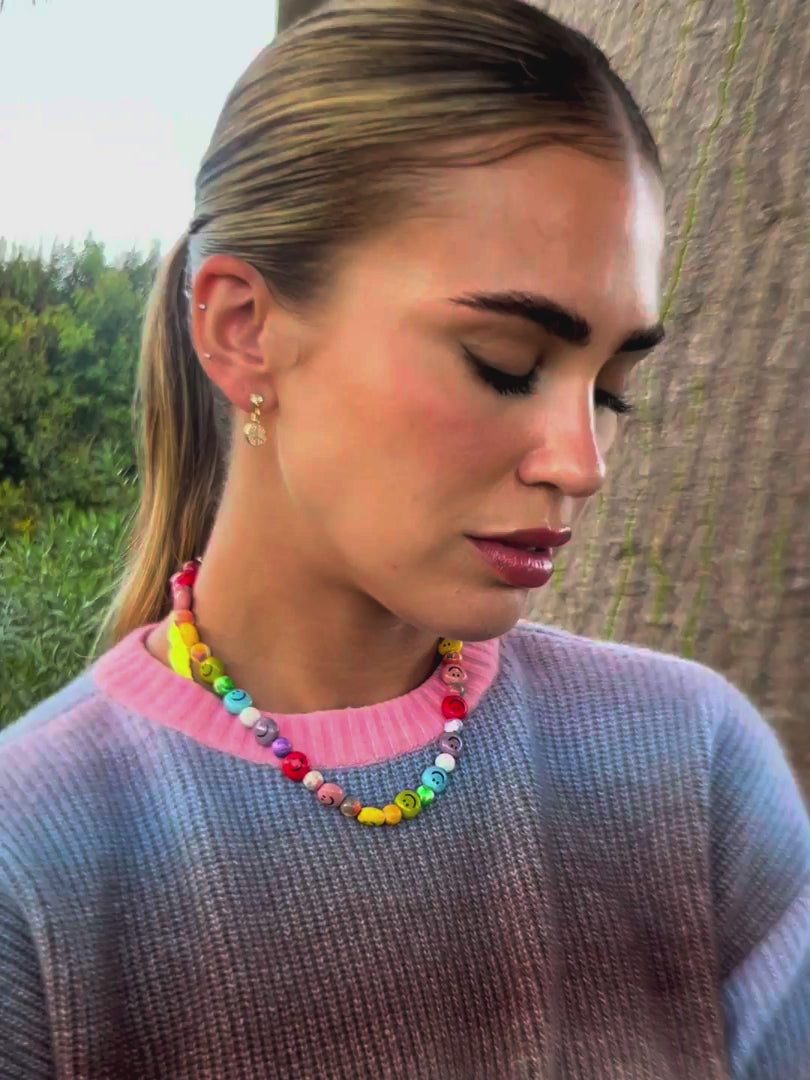 Brighten your look (and your day) with the Rainbow of Smiles Necklace. Strung with vibrant tie-dye glass beads and cheerful rainbow smiley face charms, this beaded piece is a playful, colorful statement of joy.