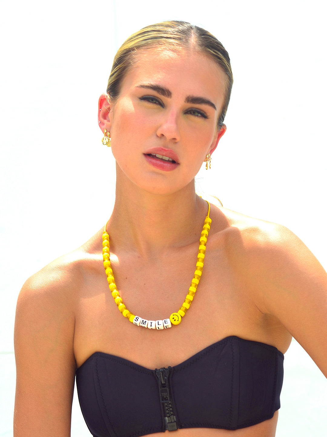 Sweeten up your look with a playful dose of good energy. The Sugar Rush Necklace features a sleek, adjustable yellow cowhide leather cord strung with glass and ceramic charms. Wear it your way—long and laid-back, or cinched as a choker for instant edge. A versatile piece that channels positivity with every wear, it’s the perfect mix of bold, fun, and effortlessly cool.