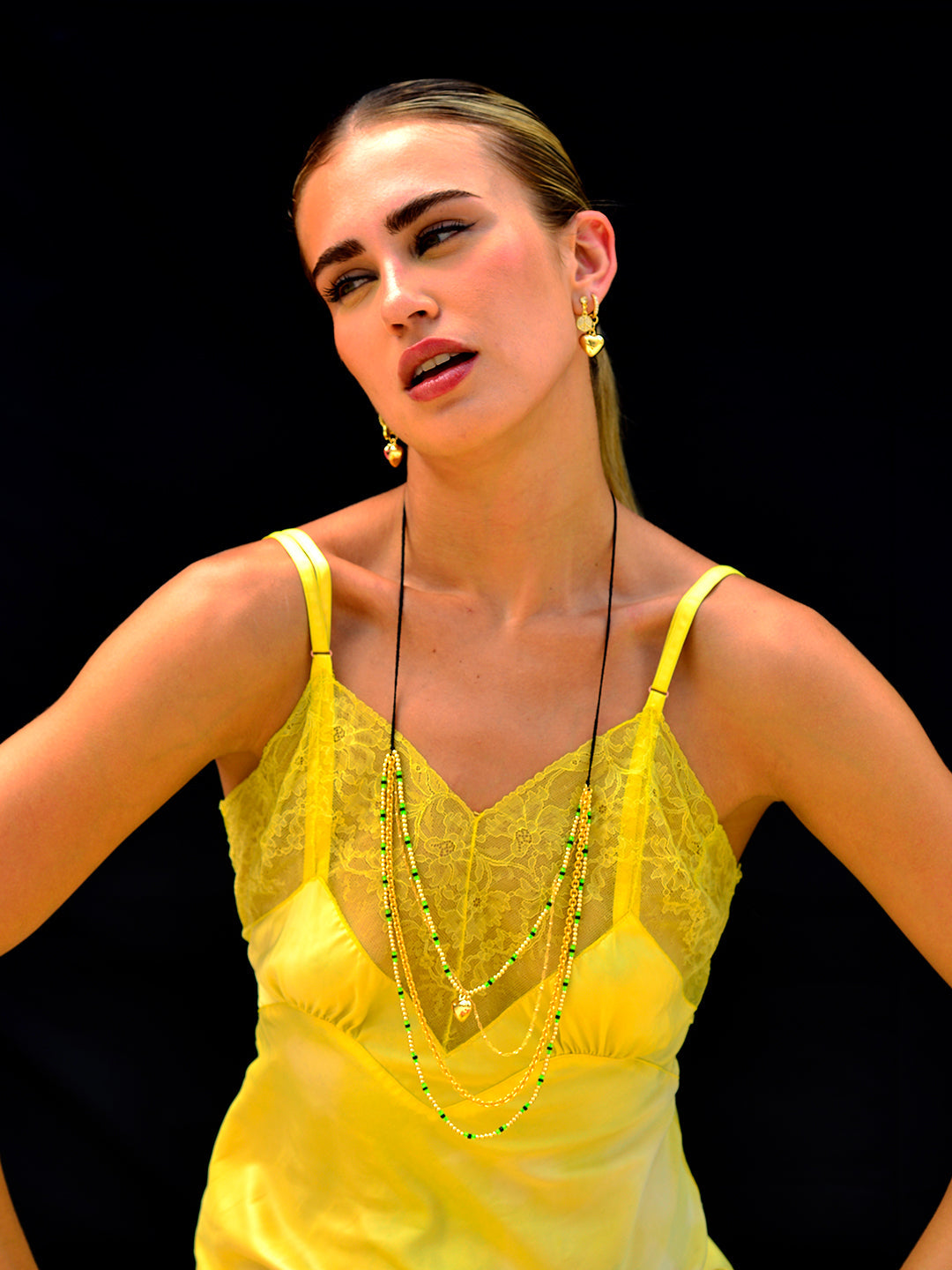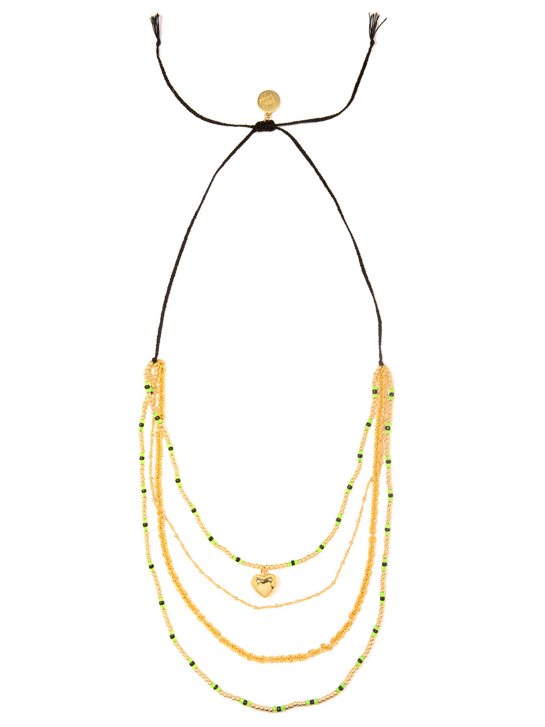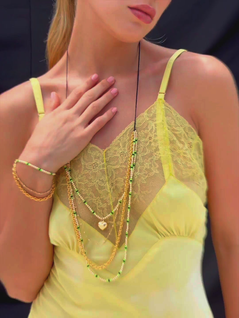 Add a touch of mystery with the Midnight Heart Necklace! Featuring adjustable black threadwork and a convenient drawstring closure, this layered piece offers a perfect fit every time. Gold chains shimmer alongsideglass charms and a dangling heart charm, letting you wear it long or as a choker for versatile, moody elegance.